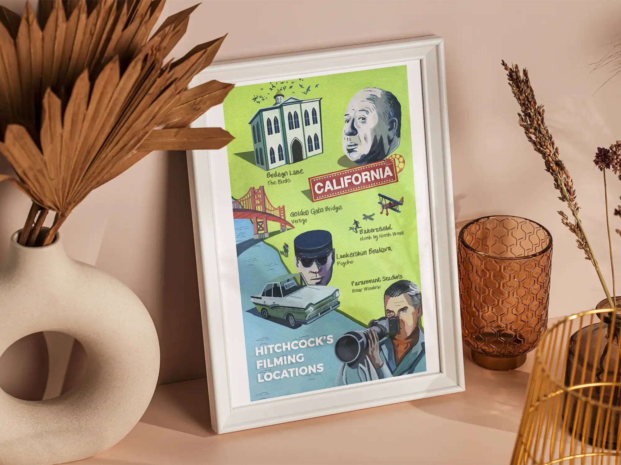 An Alfred Hitchcock map art print, illustrating all of the filming locations of this iconic film director. Are you a big fan of Alfred Hitchcock, know someone that loves Rear Window (Haydn’s favourite film of all time), or loves film? Well you’re in luck, as this illustration wall art is for you!