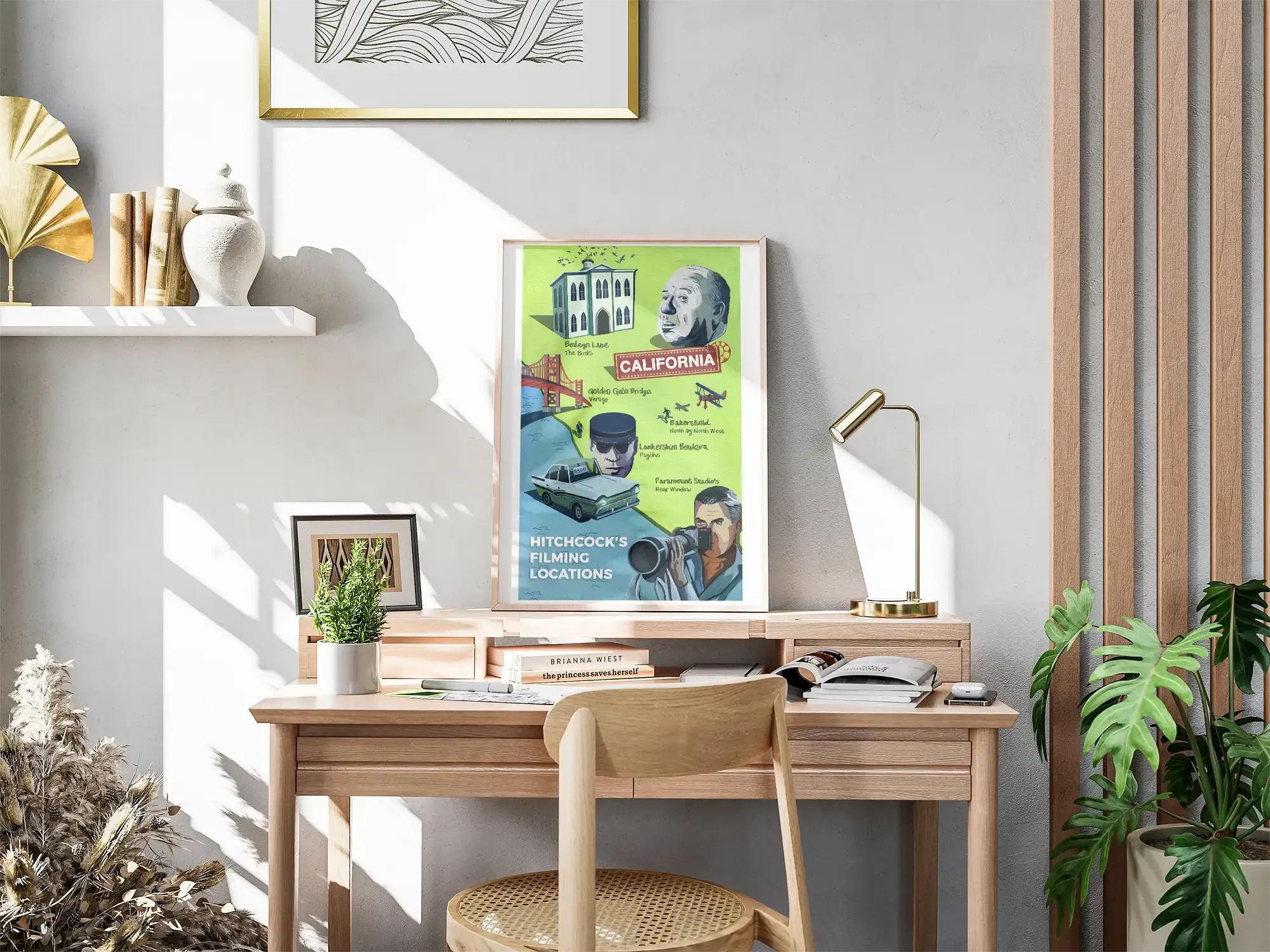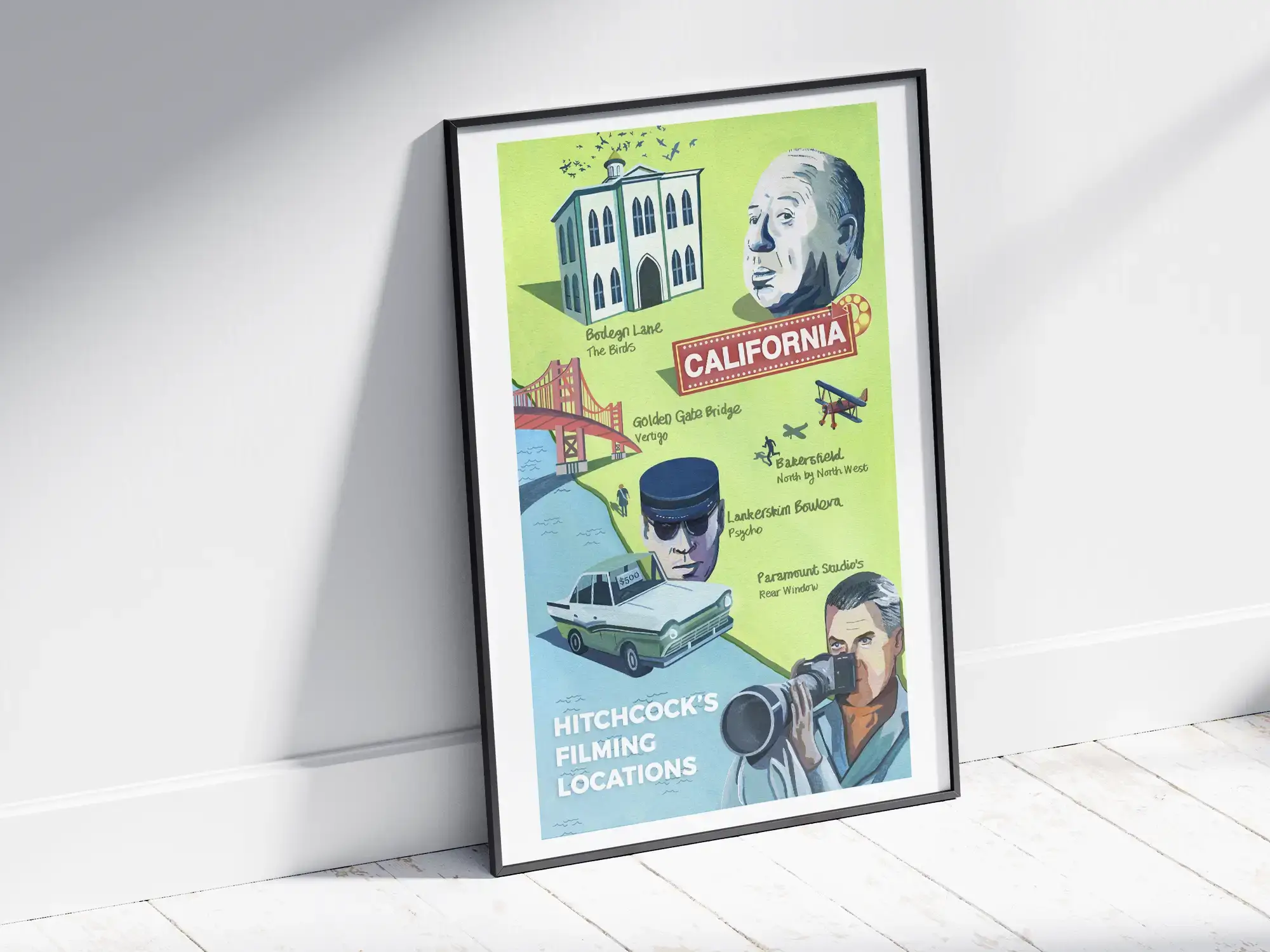 Originally produced with gouache, watercolour and edited digitally. This illustrated map shows the filming locations of Hitchcock’s most famous films, which are all based in California. Featuring Rear Window, The Birds, to Vertigo. This illustrated art print would make a great addition in your home, or someone else’s home if you’re buying as a gift.