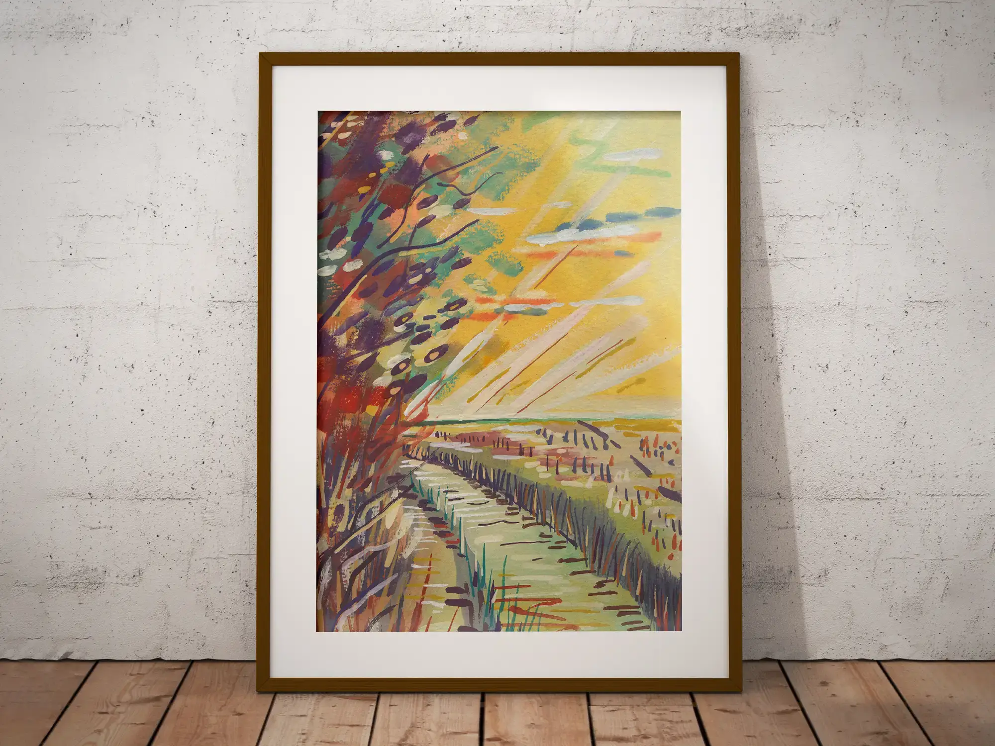 This is a borderless original painting, created using a limited colour palette revealing this vibrant countryside painting.